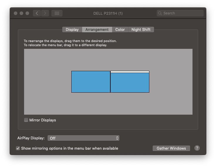 Since I upgraded to Mojave, my dual monitors changed behaviour. (The default icons ran down the right of the left hand screen. I wanted them on the right of the right hand screen.)